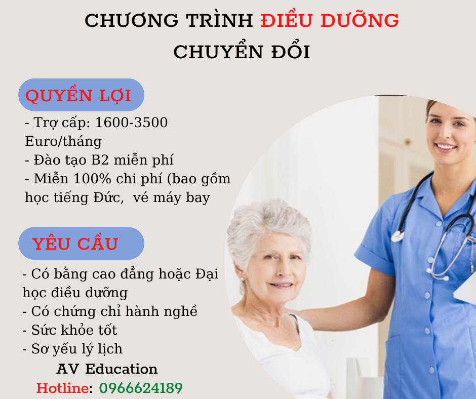 Hiện nay, có rất nhiều bạn điều dưỡng viên muốn sang Đức làm việc. Để đáp ứng nhu cầu này, AV Education quyết định sẽ đem tới cho các bạn một chương trình hoàn toàn miễn phí. Khi tham gia chương trình này, các bạn sẽ được đào tạo tới B2 miễn phí và miễn phí luôn cả tiền vé máy bay.